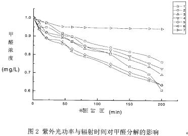 由圖可見,含納米二氧化鈦的纖維材料經(jīng)不同時(shí)間的紫外光照射處理后均可不同程度的分解甲醛氣體,其中紫外光照射的功率與照射時(shí)間均是影響納米二氧化鈦光催化效果的重要影響因素。