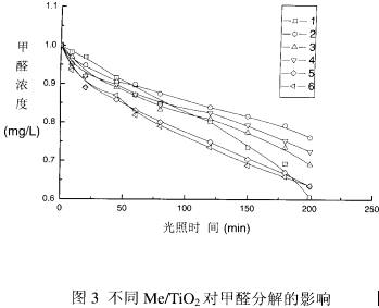 由圖3中的曲線6可見:當(dāng)添加的Me為Pt時(shí)對甲醛的分解基本呈直線,其分解率在200 min內(nèi)可達(dá)到35%;圖7中的曲線1表示以Pd作為添加物時(shí),存相同時(shí)間內(nèi)對甲醛的分解量僅為24%,而曲線2、3、4表明當(dāng)銅作為添加劑時(shí)最終對甲醛的分解量可達(dá)到27.5-40%。由此可見:為提高光觸媒對甲醛的光分解效率,利用超臨界金屬注入適量重金屬粒子后可使納米二氧化鈦的催化效果分別提高。