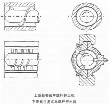 下圖是普通單螺桿擠出機(jī)同往復(fù)式單螺桿擠出機(jī)結(jié)構(gòu)比較: