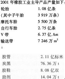 我國橡膠工業始建于1915年的廣東兄弟創制樹膠公司,迄今已有88年歷史。1949年建國以前,橡膠工業很弱小,年耗膠量僅1.3萬t,生產輪胎3萬條,大部分橡膠制品依賴國外進口。建國以后,橡膠工業經歷了由小變大、由弱變強的發展歷程。到改革開放開始的1978年,耗膠量增加到 43萬t,輪胎產量達到936萬條,橡膠工業初具規模。改革開放政策給橡膠工業帶來了勃勃生機,經過20多年的快速發展,到2001年耗膠量達到 230萬t,僅次于美國,居世界第二位。輪胎產量達 1.08億條,僅次于美國、日本,居世界第三位。自行車胎、膠鞋產量則居世界首位。中國橡膠工業現已形成由輪胎、自行車胎、膠管、膠帶、膠鞋、膠布、密封、減震隔震、建筑防水、醫療衛生、日用橡膠、電子橡膠、油田橡膠制品等18個大類5萬多個產品規格組成的,包括橡膠原材料、產品、生產設備和檢測儀器、科研設計、新產品開發在內的體系完整的大產業。橡膠工業占化學工業總產值 1/5,利潤、利稅為1/4,成為國民經濟中舉足輕重的重要產業。