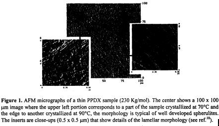 The behavior of the lamellar thickness as a function of isothermal crystallization temperature was examined by AFM (Fig. 1) together with melting point data obtained by DSC. Through the use of the Thompson-Gibbs equation we were able to obtain, a value of the fold surface free energy for PPDX, i.e., 166 erg/cm2. This value is in the same range as those obtained previously for similar linear polyesters.