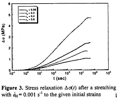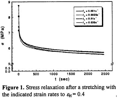 In stress relaxation experiments the sample was stretched at a constant strain rate to a certain strain. Then, keeping the strain fixed, stress was allowed to relax. Stress relaxation followed a logarithmic time-law until a final value was reached. The total amount of relaxed stress represents the contribution of the viscous stress. A subtraction of the viscous stress from the measured stress yields the true stress-true strain relationship which would be obtained in the limit of zero strain rate. This "quasi-static" stress-strain dependence includes the contribution of the , amorphous network and the stress transferred by the skeleton of crystals.