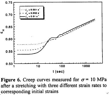 Creep measurements were carried out by stretching the sample at a constant strain rate to a certain stress, thereafter the stress was kept fixed. The measurements showed that creep also follows a logarithmic time-law. During creep the viscous stress decreases. The loss of viscous stress is compensated by the increase of the stress contributed by the network and skeleton. The kinetics of stress relaxation and creep are related to each other, as can be shown by model considerations.