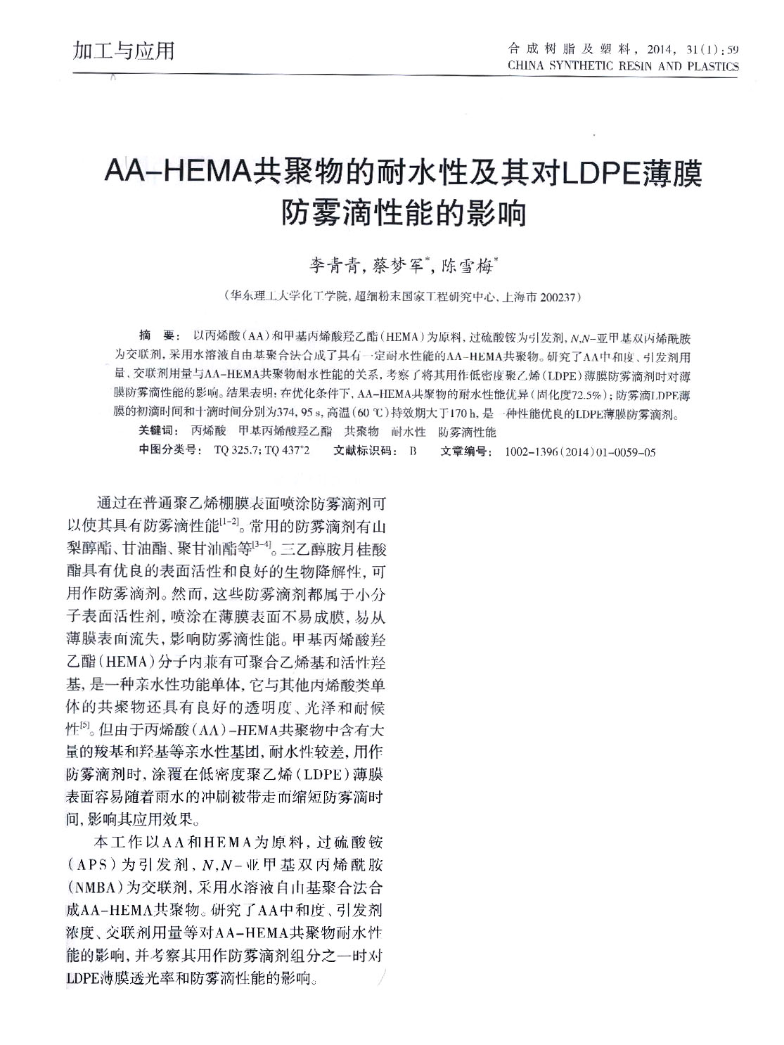 以丙烯酸(AA)和甲基丙烯酸羥乙酯(HEMA)為原料,過硫酸銨為引發(fā)劑,N2N-亞甲基雙丙烯酰胺為交聯(lián)劑,采用水溶液自由基聚合法合成了具有一定耐水性能的AA-HWMA共聚物。研究了AA中和度、引發(fā)劑用量、交聯(lián)劑用量與AA-HWMA共聚物耐水性能的關(guān)系,考察了將其用作地低密度聚乙烯(LDPE)薄膜防霧滴劑時對薄膜防霧滴性結(jié)果表明:在優(yōu)化條件下,AA-HWMA共聚物的耐水性能優(yōu)異(固化度72.5%);防霧滴LDPE薄膜的初滴時間和十滴時間分辨為374.95s,高溫(60。C)持效期大于170h,是一種性能優(yōu)良的LDPE薄膜防霧滴劑。