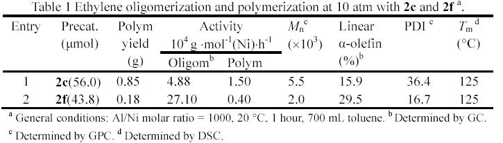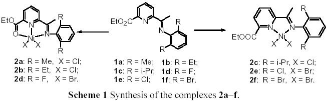 The ligands 1a−f were prepared according to the previously reported procedures.4 Complexes 2a−c were obtained by stirring the ethanol solution of NiCl2⋅6H2O with the ligands 1a−c, while the complexes 2d−f were prepared by the reaction of (DME)NiBr2 (DME = 1,2-dimethoxyethane) with the corresponding ligands 1d−f (Scheme 1). These complexes were characterized by IR spectroscopic and elemental analysis. Furthermore, complexes 2a, 2b, 2d, 2e and 2f were characterized by X-ray diffraction and selected molecular structures of 2a and 2f are shown in Fig 1 and Fig 2. As is shown by the X-ray crystal structure, the carbonyl oxygen in the ester group in 2a coordinates with the nickel center, while the carbonyl oxygen in 2f is free from coordination.