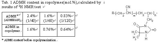 通過不同氫原子積分面積可求出兩種單體在共聚物中的含量,計算結果見Tab. 1. 從Fig.2可以看出,隨ADMH/AN比值的減小,單體的總轉化率增加;而且當ADMH/AN≤1/100時,共聚反應的單體總轉化率大于丙烯腈均聚時的單體轉化率。
