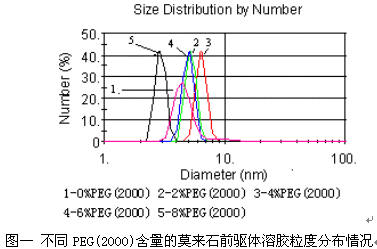 圖一為5個不同PEG(2000)含量的溶膠粒度分布情況??梢钥闯霾患覲EG(2000)的溶膠粒度分布多分散性差,粒徑峰分布較寬;而其余四個均具有良好的多分散性,粒徑分布較窄。其中,PEG(2000)含量為4%的溶解粒徑最大,而含量為8%的最小。我們分析這是由于PEG(2000)在溶膠中含量的不同,對溶膠粒徑起到了不同的作用。首先,添加的PEG(2000)在膠粒形成和生長的過程中起到了控制膠粒粒徑的作用,從而使溶膠的粒徑分布均勻,多分散性良好。其次, PEG(2000)具有橋聯和包裹膠粒的有作用。PEG(2000)含量為2%的溶膠由于PEG加入量較少,作用不是很明顯;而PEG(2000)含量為4%的溶膠PEG的橋聯作用達到最大效果,形成的簇團具有較大的粒徑;隨著PEG含量的進一步增加,有足夠的PEG(2000)能夠包覆膠粒表面,包裹膠粒起到了主要作用,抑制了膠粒的長大,在PEG(2000)含量到達8%時達到較好的效果。
