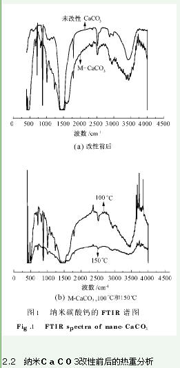 采用X(S)K160型開(kāi)煉機(jī)進(jìn)行生膠的塑煉及與各種配合劑的混煉;采用UR2030型硫化儀測(cè)定正硫化時(shí)間;采用25t平板硫化機(jī)進(jìn)行試樣的硫化,硫化溫度為150℃.1.3 測(cè)試與表征傅立葉變換紅外光譜(FTIR)研究采用美國(guó)NicoletMEGNA_IR760型紅外光譜儀,試樣與溴化鉀混合研磨后壓片;熱重分析(TGA)分析采用美國(guó)TA公司TGA2050型熱重分析儀,氮?dú)獗Wo(hù),升溫速率10℃/min;掃描電鏡(SEM)研究采用德國(guó)里奧公司LEO1530VP掃描電鏡,納米碳酸鈣表面和硫化膠斷面鍍金;硫化膠交聯(lián)密度(Vr)采用平衡溶脹法測(cè)定,溶劑為正己烷;硫化膠各項(xiàng)力學(xué)性能均按有關(guān)的中國(guó)國(guó)家標(biāo)準(zhǔn)進(jìn)行測(cè)定.