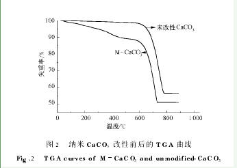 圖2的TGA曲線表明,未改性的CaCO3加熱至620℃才開(kāi)始失重,分解為CaO和CO2,最大失重溫度751℃;MCaCO3有兩個(gè)失重臺(tái)階:第一次失重起始溫度為200℃,最大失重溫度381℃,為有機(jī)改性劑的分解;第二次失重起始溫度為559℃,最大失重溫度714℃,為CaCO3的分解.這是由于有機(jī)改性劑的引入使CaCO3的表面結(jié)構(gòu)發(fā)生了變化,促進(jìn)了納米碳酸鈣的分解所致.