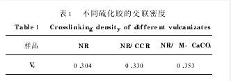 表1所列為交聯(lián)密度測(cè)定結(jié)果.從表中可看出,NR/MCaCO3納米復(fù)合材料的交聯(lián)密度顯著高于NR和NR/CCR體系,說(shuō)明MCaCO3參與了交聯(lián)反應(yīng),從而使NR/M-CaCO3納米復(fù)合材料交聯(lián)密度增加.