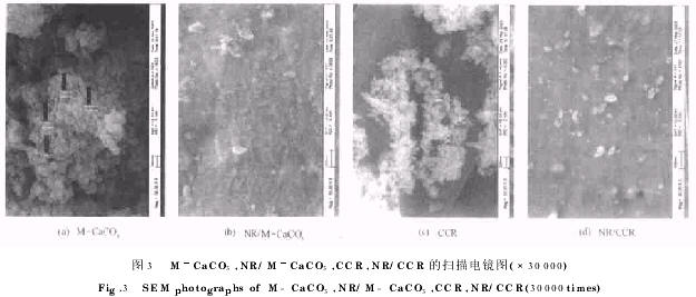 圖3是CCR和MCaCO3粉末、NR/CCR和NR/MCaCO3硫化膠的SEM圖,從圖中可見(jiàn),MCaCO3粒子尺寸明顯比CCR粒子均勻,粒徑均為40~80nm的圓形顆粒.CCR和MCaCO3顆粒在NR硫化膠中分散均勻,但CCR界面清晰,部分粒子凸出于斷面表面,粒子表面無(wú)附膠,說(shuō)明CCR與橡膠基體結(jié)合力弱;而MCaCO3大多數(shù)粒子被橡膠包埋,粒子與橡膠基體之間界面模糊,結(jié)合緊密,少數(shù)凸出于斷裂面的粒子表面有明顯的附膠,說(shuō)明經(jīng)改性的碳酸鈣粒子與橡膠基體之間產(chǎn)生了較強(qiáng)的結(jié)合.