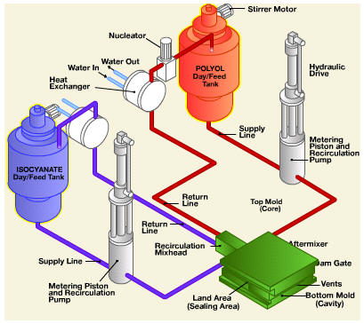 反應(yīng)注塑設(shè)備最初由德國研制,現(xiàn)由多家廠商銷售。反應(yīng)注塑系統(tǒng)的基本元件包括:狀態(tài)調(diào)理系統(tǒng),用於準(zhǔn)備液態(tài)中間體;計量泵系統(tǒng),確保以規(guī)定的數(shù)量和壓力泵送中間體;一個或多個混合機頭,通過撞流混合方式混合液態(tài)中間體;載模架,使模具按要求取向,適時開模和合模,便於清潔和脫模。