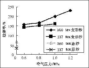 圖.1 空氣壓力和涂塑率之間的關系變形紗和原紗涂塑率的比較