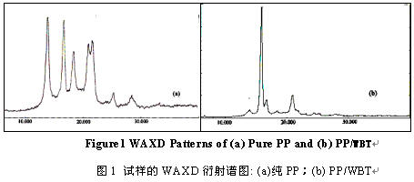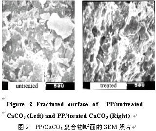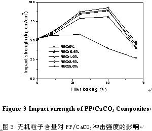 本工作制備了一種新型稀土多功能助劑WBT,結構上的特點,使得該助劑同時具有以下幾種作用:首先,它是聚丙烯(PP)的一種高效b成核劑,從Figure 1可以看出,加入0.1%的WBT,可以誘導聚丙烯(均聚物,牌號F401)產生高達90%的b晶型;其次,它又是一種高效的的偶聯劑,對碳酸鈣、硫酸鋇等無機粒子具有很好的表面處理作用,用其處理的碳酸鈣,以1:1的比例加入PP得到的復合物,沖擊斷口用掃描電子顯微鏡觀察,如Figure 2所示,可以看出,用WBT處理的CaCO3,在PP中分散性好,斷口呈明顯的塑性破壞,不象未經處理的CaCO3,在PP中團聚明顯,斷口呈明顯的脆性破壞。同時,WBT還是一種優良的加工助劑,在70/30的PP/CaCO3復合物中,如果CaCO3未經處理,復合物的熔體流動速率(MFI)不足純PP的30%,而用2.5%的WBT處理過的CaCO3體系,MFI與純PP相當。用不同用量WBT處理后的CaCO3加入PP得到的復合物,缺口沖擊強度與無機粒子含量之間的關系如Figure 3所示:對于50/50的PP/CaCO3 體系,當REC的用量分別為0.5, 1.0, 2.5, 5.0%時,缺口沖擊強度分別為 8.10、9.32、8.92和9.01 kg.cm/cm2, 分別高于純PP約 50%、80%、70% 和 72%。在本工作所采用的REC用量中,2.5% 時體系具有最大的沖擊強度,50/50的PP/CaCO3 的體系,沖擊強度可達到純PP的1倍以上。