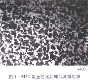 圖1為S45C鋼強韌化處理后的顯微組織,組織為粒狀珠光體及鐵素體,晶粒度10~12級,晶粒直徑∮5-∮10μm,硬度200-230HBS。