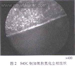圖2為S45C鋼氣體加氧軟氮化后的金相組織,白亮層為ε-Fe2-3(N.C)單相層,厚度10-25μm。