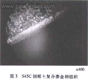圖3為S45C鋼經過稀土復合滲表面強化處理后的顯微組織,工件由表及里顯示的金相組織依次為:氧化膜--白亮層化合物--擴散層--次擴散層-基體組織。