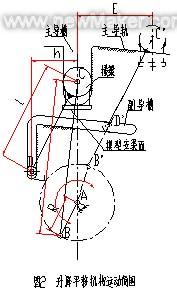 采用升降平移運動形式時,橫梁端軸的運動軌跡與采用升降翻轉運動形式基本相同。根本區別在于,它的副導槽是一個中心線與橫梁端軸中心運動軌跡完全相同的封閉式導槽。因而在橫梁的整個運動過程中,其端軸中心軌跡與副連桿軸中心的軌跡完全相同。橫梁保持平動。圖2為其機構運動簡圖。