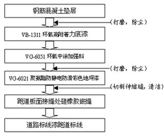 跑道面層施工主要有6項(xiàng)內(nèi)容:50mm 厚細(xì)石鋼筋混凝土墊層(內(nèi)配φ4@150 雙向鋼筋網(wǎng)片);高滲透、高附著力環(huán)氧底漆;3 mm 環(huán)氧樹(shù)脂石英砂漿加強(qiáng)層;面層采用高耐候、高耐磨聚氨酯地坪漆,配以60~80#高強(qiáng)度金剛砂防滑工法施工;跑道板面硅橡膠嵌縫;標(biāo)線漆跑道標(biāo)線。