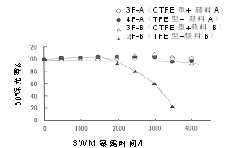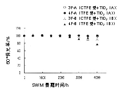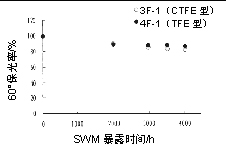 根據日本文獻的試驗結果,來比較3F型和4F型FEVE的耐候性。文獻中介紹,通過一種陽光老化機(SWM:Sugn測試儀器有限公司)暴露結果如圖1所示[2]。