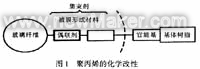 玻璃纖維氈增強熱塑性復合材料(Glass mat reinforced thermoplastics,GMT)是以熱塑性樹脂為基體,以玻璃纖維氈為增強骨架的板片結構材料。具有韌性好,強度高,密度小(僅為金屬的1/5—1/7),優良的耐腐蝕性和耐熱性,良好的成型性,廢料可再生利用并可長期存放等優點,是低能耗、無環境污染的綠色環保材料,是現今國際上極為活躍的復合材料開發品種,有廣泛應用領域,銷售量逐年增長。 采用不同的玻纖氈和不同的熱塑性樹脂可以得到不同性能和價格的GMT片材,本文是研究“熱熔法”工藝,以玻針氈為增強骨架,以價廉的聚丙烯為基體的復合材料。 2 玻璃纖維氈增強聚丙烯片材的研究 2.1 制備中的關鍵技術 樹脂基體與玻纖的界面結合技術和融熔浸漬工藝是制備的關鍵技術。良好的界面能充分發揮聚丙烯基體和玻纖氈兩種絕然不同材料的優點,出現1+1>2的情況。聚丙烯等熱塑性樹脂,熔體粘度很大,對玻纖氈的浸漬十分困難,為實現很好的浸漬,除有良好的復合界面外,還要有相應的匹配工藝,需優化操作工藝參數,選擇合適的玻纖氈等。 2.2 聚丙烯基體的選擇與改性 聚丙烯是非極性高聚物,與玻纖毫無親和性,為使復合片材有優良的拉伸、彎曲、沖擊和熱性能等綜合性能,必須對聚丙烯基材進行選擇和改性。 2.2.1 聚丙烯基材的選擇 在選擇聚丙烯時,首先要考慮聚丙烯基體本身應具有較高的力學等綜合性能,還要使其有良好的工藝性能。據熱熔法工藝特點,要求聚丙烯在熔融態時,有較低的熔融粘度,使其能比較容易地滲入玻纖氈和浸潤玻纖,并在片材在進行二次甚至多次的熱成型加工時有良好的工藝流動性。熔融指數MI是表征熔融粘度的指標,而聚丙烯的分子量與MI有如下關系:MI小,分子量大;反之,分子量小。MI小的聚丙烯,由于分子量大,力學性能較優,但在熔融態下,粘度大,難于滲透與浸潤玻纖氈,使基體與玻纖氈間結合力差,結果降低了復合片材的力學性能。MI大的聚丙烯,分子量小,本身力學性能較差,但在熔融態下,粘度較小,易于滲透與浸潤玻纖氈,使基體與玻纖氈間有較好的結合力,其協同作用的結果,使產品有較好的力學性能。因此,要選擇適當MI值的聚丙烯。 經綜合試驗,選擇了新研制的聚丙烯,它流動性好,分子量分布狹窄,成型加工溫度較低,是節能型聚丙烯。 2.2.2 聚丙烯的改性 發展了多種改性技術:物理改性(引入成核劑,正、付抗氧劑,熱穩定劑,紫外線吸收劑、抗靜電劑等多種助劑);化學改性(通過化學反應引入;與樹脂基體有良好相溶性;對玻纖中偶聯劑有結合力;能滲透的特種極性基團,見圖1)。