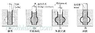 擠脹成型的基本工藝過程如右圖所示。將管坯放入模具并在管坯內(nèi)填入脹形介質(zhì)(a);對管坯及其內(nèi)部的脹形介質(zhì)施加擠壓力F,使管坯材料在一定的應力狀態(tài)下變形(b);管坯在脹形介質(zhì)產(chǎn)生的內(nèi)壓作用下得到與模腔形狀相同的制件(c),卸載後脹形介質(zhì)回復,取出成型制件(d)。