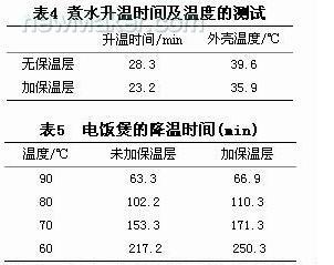 由表4、表5的結果可以看出,采用加聚氨酯保溫層的電飯煲具有一定的保溫性能,因此可明顯地縮短煮飯時間,節省電能。