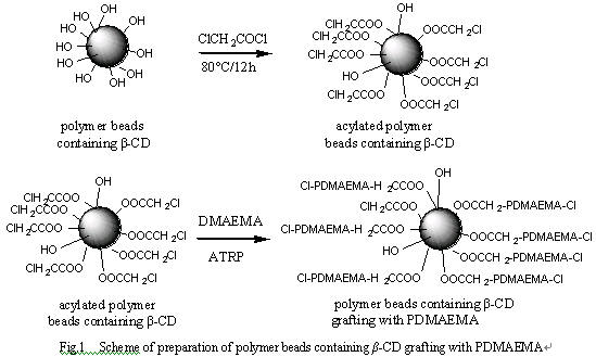 β-環糊精(β-Cyclodextrin, β-CD)是一個中空環狀低聚糖化合物,具有腔內疏水、腔外親水的兩親性特點,并可與各種客體化合物形成超分子包合物[1]。β-環糊精經高分子化后,具有獨特的物理化學性能,既能保持環糊精包結、緩釋、催化的能力,又兼具高聚物較好的機械強度和化學可調性等 [2]。環糊精高聚物作為藥物載體,可有效地應用于藥物控制釋放[3]。藥物通過與環糊精形成包合物可以提高其穩定性和溶解性,以增強其生物利用度,緩解藥物對腸胃的刺激。但是,一般的β-CD高聚物不能對環境變化有響應性,因而不具有定向輸送藥物的特性。聚甲基丙烯酸-N,N-二甲氨基乙酯(PDMAEMA)是一種具有溫度和pH敏感性的高分子,分子結構中同時具有親水性的叔氨基、羰基和疏水性的烷基基團,當環境改變時會造成氫鍵的形成與破壞,從而導致高分子相態的變化。因此,嘗試把PDMAEMA鏈段接枝到β-CD微球表面,從而得到一種環境敏感性的β-CD微球用于藥物的控制釋放研究應是一項有意義的工作。從這一研究目的出發,具體合成步驟為:首先采用反相微懸浮乳液聚合得到β-CD微球,然后對β-CD微球進行氯乙酰化的處理,最后通過原子轉移自由基聚合把PDMAEMA接枝到β-CD微球上(如圖1所示)。