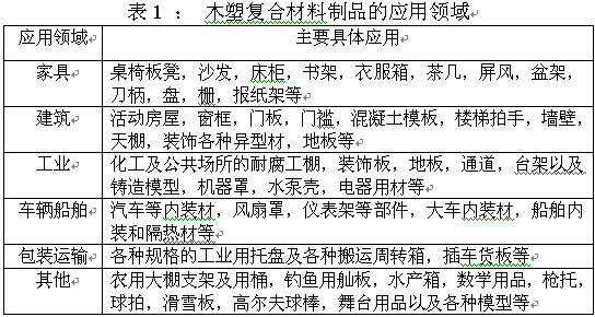 作為一種新型的木材替代材料,綠可木塑可廣泛應用于建筑裝飾和包裝等領域,如邊角線、刨花板條、窗簾、門斗、地板、籬笆、踢腳板、美術板、百葉窗、鏡框、相框、窗框、玩具及普通家具用品等,絕大多數的室內外裝飾建材均可用綠可木塑來制造。特別值得指出的是,綠可木塑具有防水、防火功能,從而可用于廚房、盥洗室等的裝飾,而這是原木所不能及的。木塑制品現已引起國際上的廣泛重視,被譽為綠色環保新型材料,將具有廣闊的發展前景。