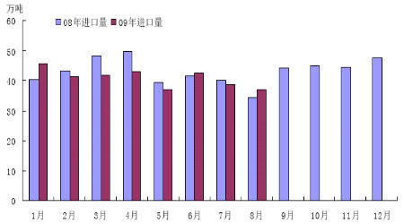 8 月2009 年8 月我國PTA 進口總量為371448.450 噸,1-8 月累計進口3270760.020 噸,進口均價911.73 美元/噸,數量較7 月減少3.97%,較去年同期減少1.78%;2009 年8 月我國其他對苯二甲酸進口總量為78974.457 噸,1-8 月累計進口768574.810 噸,進口均價868.05 美元/噸,數量較7 月減少20.39%,較去年同期減少32.90%。