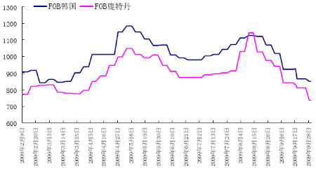 合同貨方面,國內中石化9 月合同預收款價為8400 元/噸,較8 月合同結算價跌400元/噸;埃克森美孚 10 月PX 亞洲合同倡導出臺為950 美元/噸(CFR,L/C 90 天),比9月報價下跌200 美元/噸;新日本石油公司10 月PX 亞洲合同倡導價為1000 美元/噸,較9月份報價跌140 美元/噸;日本出光石化9 月份亞洲合同倡導價為1170 美元/噸。