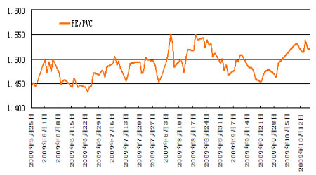 這樣以來,在剩下的一些因素里,我們認為最有可能的是LLDPE與PVC跨品種套利的資金勢力拉動了PVC的上漲。從下圖中可以看到,在PVC期貨上市之后的大部分時間里,PE/PVC的價差主要控制在1.45-1.50之間;但是在9月底以后,隨著連塑的暴漲,比價迅速升至1.50以上,可能有部分市場人士認為這是一個跨品種的套利窗口,采取了賣PE,買PVC的操作策略,從而拉動了PVC的期貨價格。