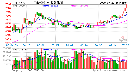 我們先來關注一下原油的走勢。毫無疑問,連續七根大根線對投資者產生的壓力是不言而喻的。美國糟糕的就業數據重新引爆了投資者對全球經濟回暖的擔擾,原油因此飛流直下。但考慮到國際經濟形勢目前應該是一個緩慢走好的格局,個人消費支出雖然沒有大幅反彈,但正在慢慢企穩,并出現上升態勢;房屋銷售數據也有所好轉,房價開始慢慢堅挺;制造業指數也在慢慢脫離衰退,逐漸臨近50關口。而美國原油庫存自5月份以來持續回落,也被大多市場人士解讀為經濟回暖的征兆。可以說,最困難的時候已經過去了,僅管現在歐、美各國公布的數據仍是良莠不齊,但經濟復蘇不可能立竿見影,原油經超跌后的大幅反彈,再修正,幅度也應該差不多了,通俗一點說,油價低了,OPEC不樂意,油價太高,對國際經濟復蘇也不利,所以,60美元左右應該是一個平衡點,后市繼續深跌的可能性較小,有可能步入震蕩筑底階段。因此,對PTA的成本壓力將會有所減弱。