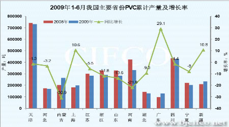 圖為2009年1-6月各省PVC累計產量及同比增長率走勢圖。(圖片來源:卓創資訊)數據來源:卓創資訊 單位:噸,%