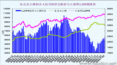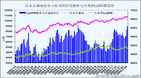 圖六:日本石腦油折合人民幣到岸完稅價與大商所LLDPE期貨價走勢圖
