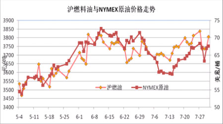 7月份,原油市場寬幅振蕩。因市場對經濟復蘇持續(xù)憂慮,加上夏季需求旺而不旺,原油在70美元附近遭到拋盤并一路下跌至60美元附近才得到支撐,隨后在美股連續(xù)上漲和美元走軟的帶動下振蕩走高至67美元上方。滬燃料油緊緊追隨原油走勢,整體呈現3650-3850元區(qū)間振蕩。