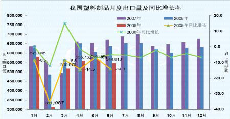 圖為2009年1-6月我國塑料制品月度出口量及增長率走勢圖