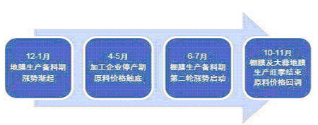 第五,季節性消費旺季對其的影響作用是不可小視的。金融危機對LLDPE市場影響較小. LLDPE作為重要的工業原料之一,廣泛的應用于農用薄膜和包裝薄膜領域中,據統計兩者在LLDPE總消費的比重超過80%。其中,農業生產領域消費的季節性決定了作為原料的LLDPE的價格走勢同樣具有一定的周期性特征。(如下圖所示) 由此看來,整個下半年,塑料商品中的LLDPE基本是出于價格攀升期。LLDPE作為市場上塑料的主要消費類型,其強勁升溫的態勢很大程度上會影響到整個塑料業在今年下年度快速升溫。