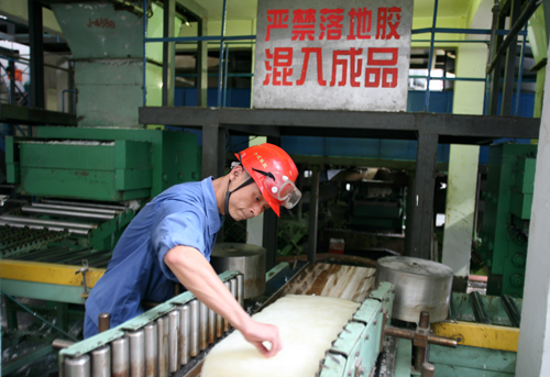 聚合車間成品工段職工在觀測剛下線的順丁橡膠成品外觀質量