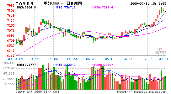 七月是熱火朝天的一個月,是激情四射的一個月。六月份的震蕩蓄勢再次為PTA積蓄了堅實的上升動力,進入七月份后,按捺不住的激情終于再次噴發,無視下半年產能能集中釋放的利空,忽略了紡織行業仍未走出低谷的壓力,PTA以火箭發射般的速度,連續六根陽線,不僅創出了自2008年10月份以來的新高,更有向8000一線發起沖擊的勢頭。單純從價格的角度上看,PTA已率先消除了全球金融危機帶來的影響。