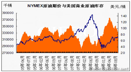 圖為NYMEX原油期價與美國商業原油庫存走勢圖。(圖片來源:北京中期)