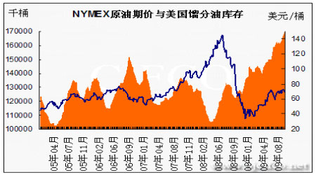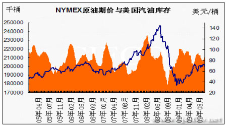 圖為NYMEX原油期價與美國汽油庫存走勢圖。(圖片來源:北京中期)