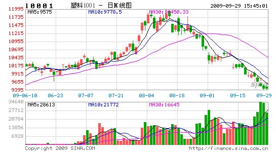 本月塑料期市承繼上月跌勢呈現震蕩下行態勢。在跌破萬點大關后,空頭部隊長驅直入,多頭被動抵抗力量微薄。市場預期的9月消費旺季的來臨似乎并未給投資者帶來驚喜。反而在國慶節前連續下挫,帶給市場悲涼的氣氛。而現貨價格的支撐力度在減弱. 受期貨大幅下滑、新擴產能釋放等利空影響快速下跌,至10000元/噸關口處跌幅有所放緩。在原油價格跌破70美圓后,美圓在76破位后雖然出現反彈,但依然未能提供給市場足夠的信心。對未來需求的擔憂才是本輪油價及塑料市場大幅下挫的重要因素。