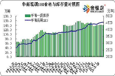 圖為華南混調180價格與庫存量走勢圖。(圖片來源:金銀島)