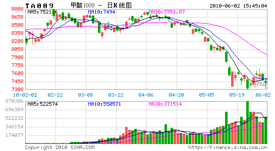 五月份以來,PTA主力合約TA009在8000元/噸附近做了一個小幅盤整后,受歐洲債務危機不斷升級,油價連續跳水的帶動下,上半個月里PTA期貨價格呈現放量快速跳水走勢,短短一個星期中幾個重要的支撐位置7800、7600被接連打穿。進入到下半個月里,在維持短暫的弱勢整理行情后,價格再創新低,最低跌至7300元/噸附近。但在本月的最后幾個交易日內,受到美國強勁經濟數據與中國否認減持歐洲債券等利好消息的刺激下,油價大幅反彈,從而帶動PTA期貨價格止跌回升。