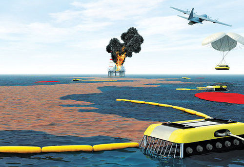 回收泄漏石油的空降機(jī)器系統(tǒng)“Aeros”是一支飛機(jī)空降的機(jī)器人部隊(duì)。這些機(jī)器人能隔離石油,利用類似離心分離機(jī)那樣的油水分離器提煉收集石油。每位機(jī)器人能在一分鐘內(nèi)凈化3000加侖(約11噸)水。這樣一支自動(dòng)化部隊(duì)能在幾天時(shí)間里將1100萬加侖(約4萬噸以上)的漏油清潔完畢,總量相當(dāng)于埃克森·瓦爾迪茲油輪的泄漏油量。