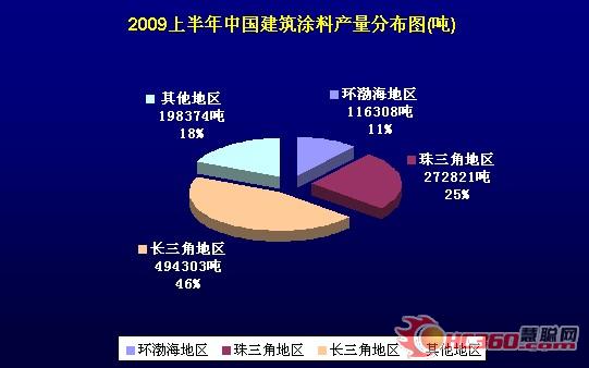 2009年上半年我國(guó)建筑涂料產(chǎn)量達(dá)108.18萬(wàn)噸。其中珠三角地區(qū)(湖南、廣東、福建)建筑涂料產(chǎn)量27.28萬(wàn)噸,占全國(guó)建筑涂料總產(chǎn)量的25%;長(zhǎng)三角地區(qū)(上海、江蘇、浙江、山東)建筑涂料產(chǎn)量49.43萬(wàn)噸,占全國(guó)建筑涂料總產(chǎn)量的46%;環(huán)渤海地區(qū)(北京、天津、河北、遼寧)建筑涂料產(chǎn)量11.63萬(wàn)噸,占全國(guó)建筑涂料總產(chǎn)量的11%;及我國(guó)其他地區(qū)建筑涂料產(chǎn)量19.83萬(wàn)噸,占全國(guó)建筑涂料總產(chǎn)量的18%。