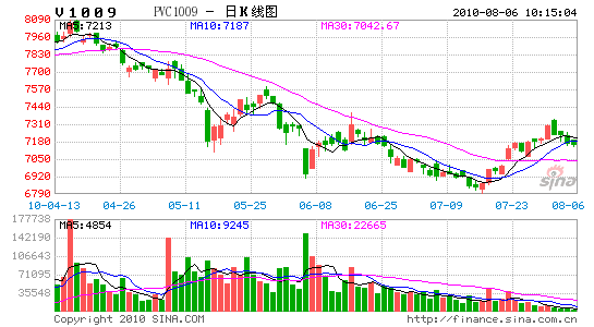 7 月份PVC前半段市場延續弱勢,后半段隨利空出盡,借農行上市、外圍商品及股市利好動觸底反彈。進入8 月份,宏觀面經濟二次探底的擔憂逐步減弱,穩增長成為短期央行調控的重點目標,為對整個商品市場復蘇發展提供良好的政策環境。PVC 雖受行業產能的限制,但總體在外圍經濟帶動下有望穩步回升。