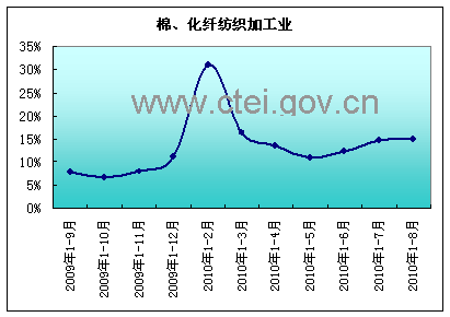 2010年1-8月棉、化纖紡織加工業(500萬元以上固定資產投資項目)累計實現投資5733269萬元,同比15.08%,增速較2009年全年水平(11.25%)變化3.83 個百分點。