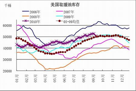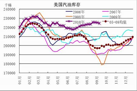 根據美國最新的庫存報告(2010 年9 月15 日公布)顯示,截止9 月10 日,美國商業原油庫存為3.574 億桶,目前為連續兩周回落,但依然處于非常高的水準,目前的原油庫存也比過去5 年的平均水平高出4000 萬桶以上。目前主要的油品庫存均處于非常高的水準,也使得供應過剩的憂慮持續存在。